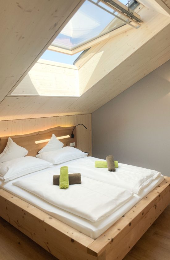 Für ein gesundes und behagliches Wohnklima wurde besonderer Wert auf natürliche Materialien gelegt: Massivholzbetten aus Zirbelkiefer, Lehmwände und eine intelligente Raumlüftung fördern Entspannung und Wohlbefinden. Auf Wunsch kann ein reichhaltiges Frühstückspaket hinzugebucht werden.